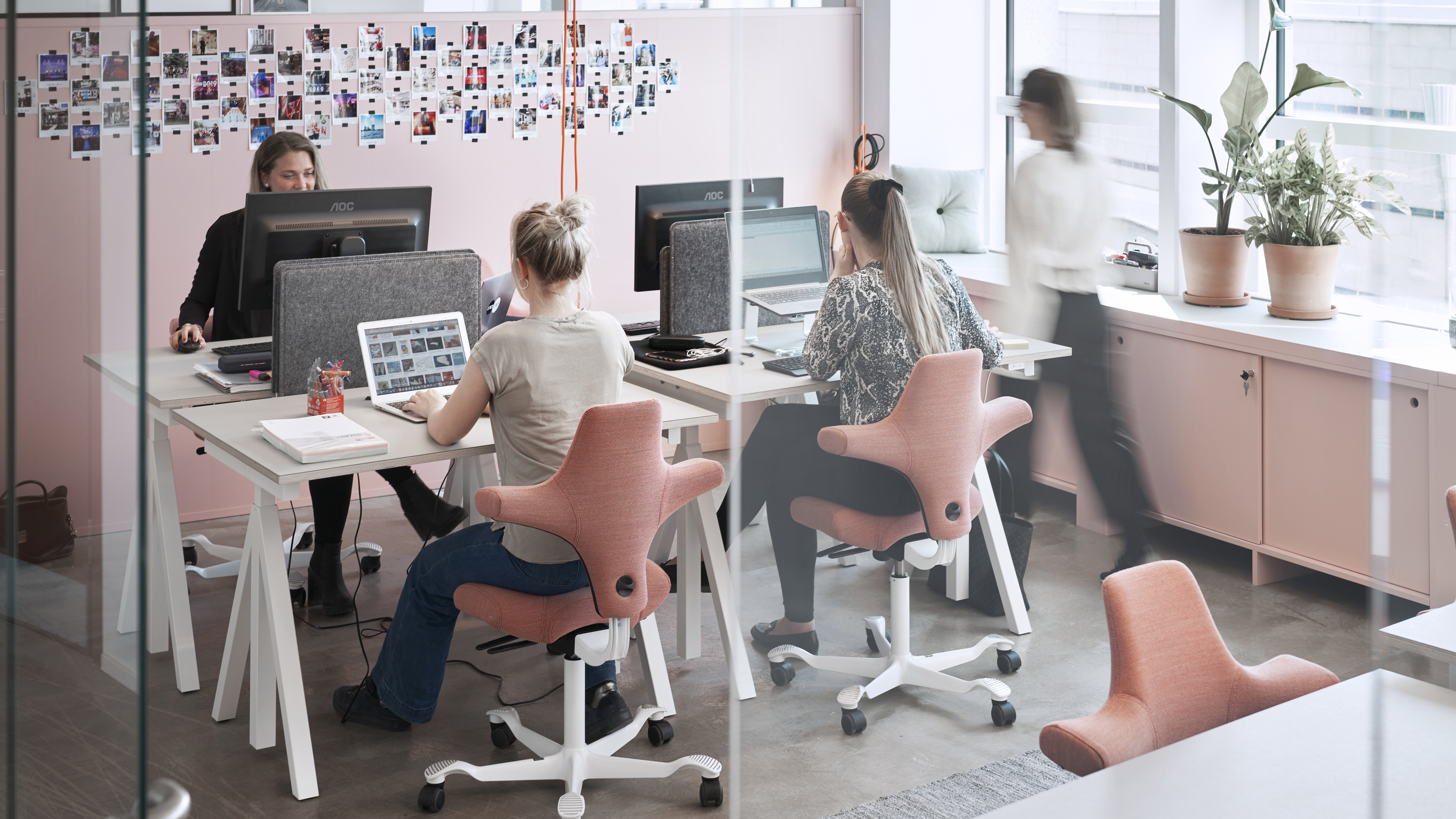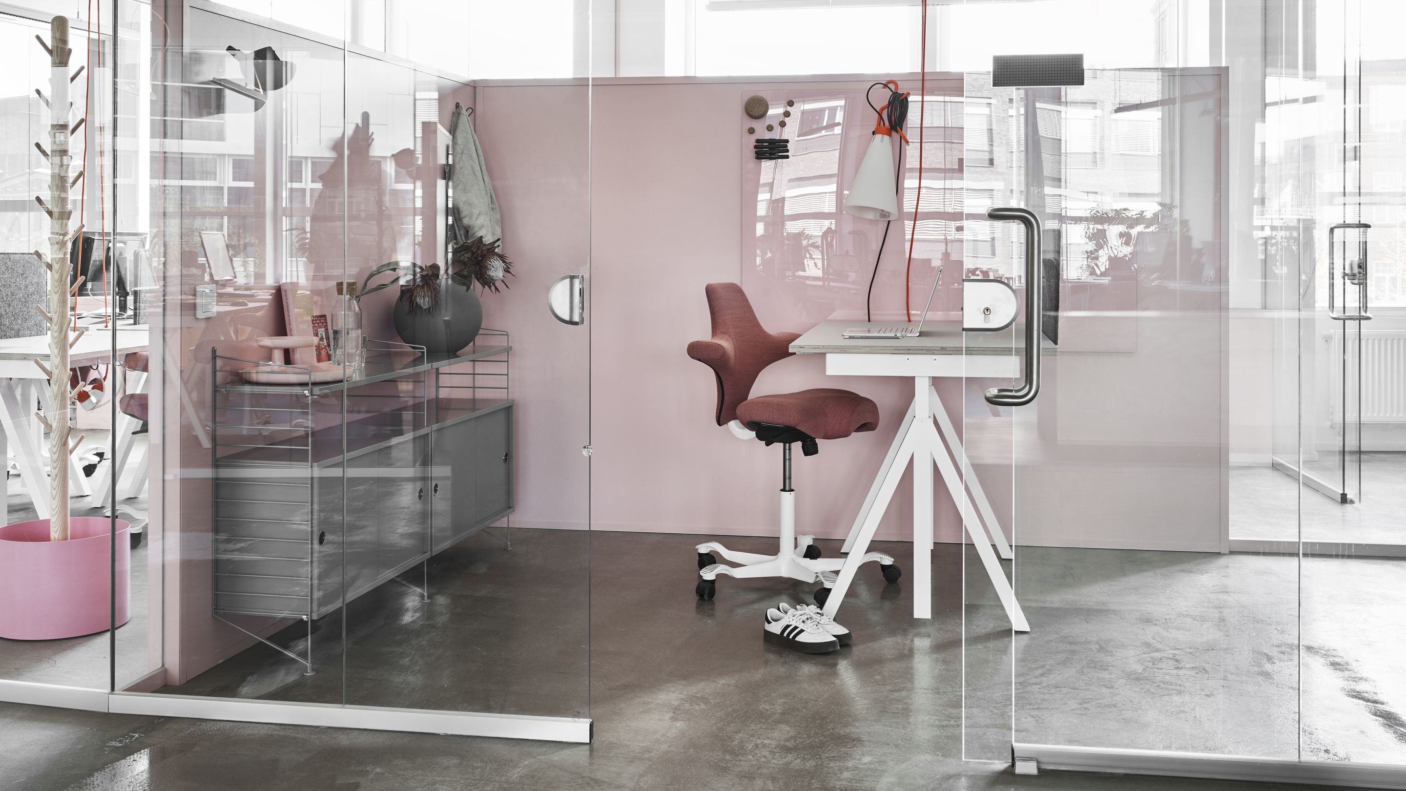 월 패널 커스텀 메이드 오렌지 / 선반 커스텀 메이드 오렌지, 피치, 핑크 / 플로어 패널 그레이 / 선반과 케비닛 그레이 / 컨퍼런스 테이블 화이트.